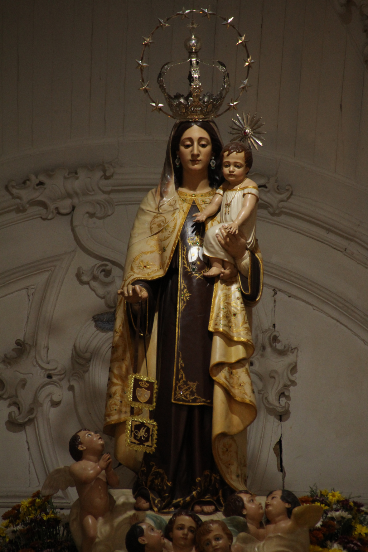 Um medalhão de Nossa Senhora do Carmo muito bem esculpido e artisticamente disposto está colocado no meio da portada. Nossa Senhora do Carmo tem como resplendor um círculo, tendo ao centro uma estrela. Tem o Menino Jesus no braço esquerdo e segura com a mão direita um escapulário, o diadema do Menino Jesus tem a originalidade de ser feito de pequenas conchas unidas. Arcanjos entre nuvens estão aos pés da imagem de Nossa Senhora do Carmo.